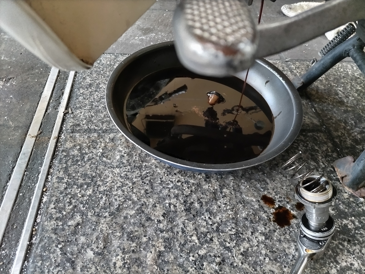 ホンダ、スーパーカブのエンジンオイル交換中ー!